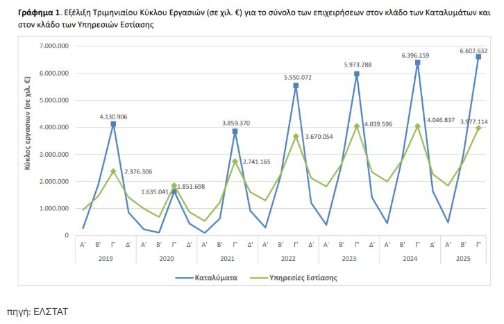 Tα στοιχεία της ΕΛΣΤΑΤ για την εξέλιξη του κύκλου εργασιών σε εστίαση και καταλύματα το γ’ τρίμηνο του 2025 επιβεβαιώνουν τα σημάδια που εκπέμπει η αγορά καθ’ όλη τη διάρκεια του 2025. Ενώ ο τζίρος στα τουριστικά καταλύματα κινήθηκε ανοδικά, κατά 3,2% σε σύγκριση με το αντίστοιχο διάστημα του 2024, η εστίαση ακολουθεί αντιστρόφως ανάλογη πορεία, με μείωση κατά -1,7%.