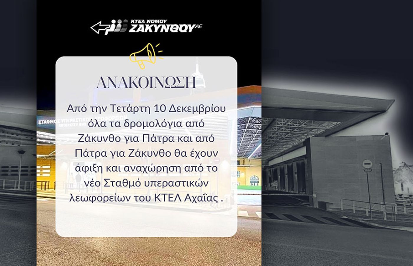 Ο νέος κεντρικός σταθμός του Υπεραστικού ΚΤΕΛ Νομού Αχαΐας Α.Ε. ξεκίνησε τη λειτουργία του στις 02:30 τα ξημερώματα της 10ης Δεκεμβρίου, εγκαινιάζοντας μια νέα εποχή για τις μεταφορές στην Πάτρα.