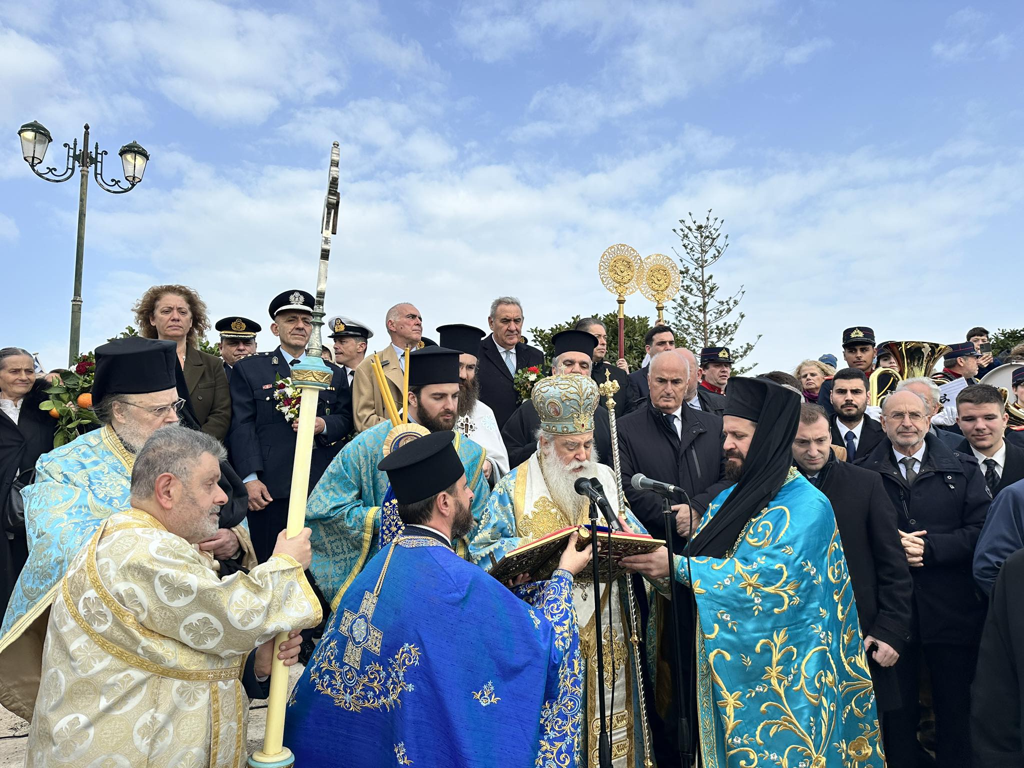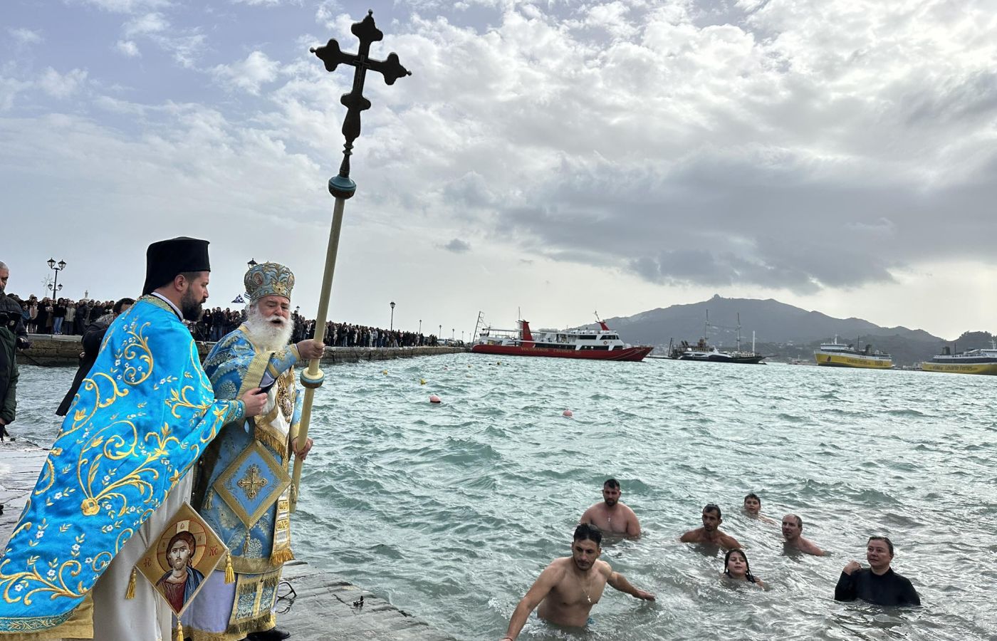 Μετά την ολοκλήρωση της Θείας Λειτουργίας, ακολούθησε ο Καθαγιασμός των Υδάτων και η Κατάδυση του Τιμίου Σταυρού στην κεντρική αποβάθρα του λιμανιού, με τη συμμετοχή πλήθους πιστών , φιλαρμονικών και Τοπικών Αρχών