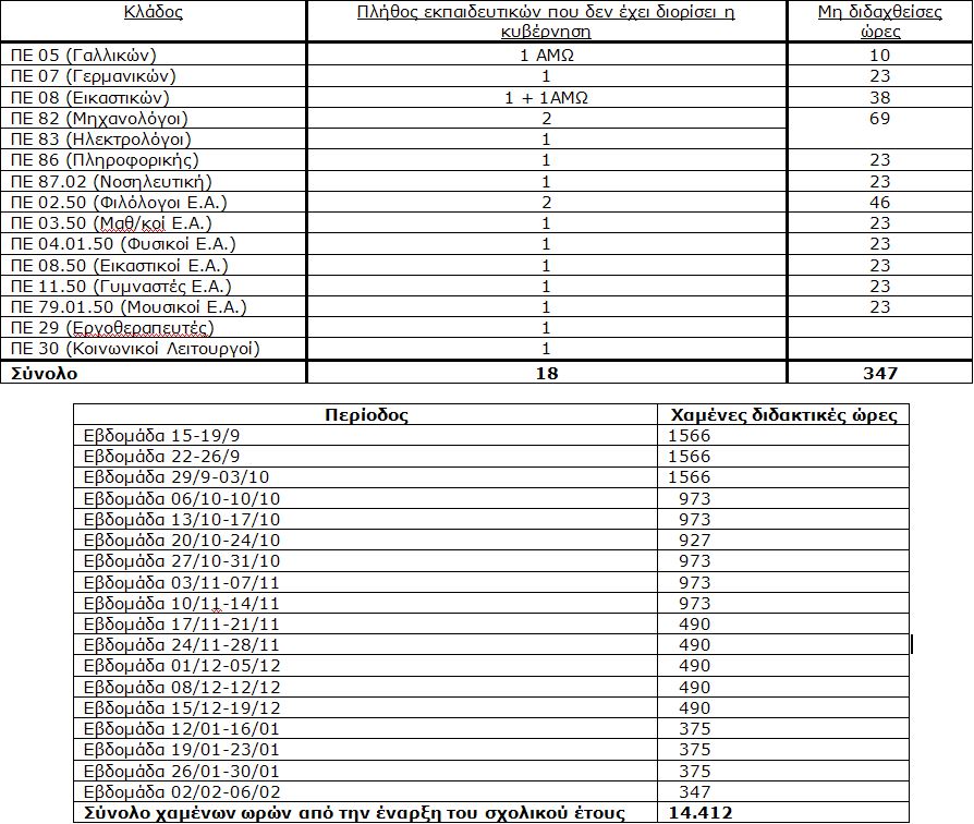 Χαρακτηριστικά αναφέρουμε ότι ολόκληρο το προηγούμενο σχολικό έτος (2024-2025) χάθηκαν 14.391 ώρες, όταν φέτος μέχρι τις αρχές Φλεβάρη έχουν ήδη χαθεί 14.412 ξεπερνώντας το σύνολο των χαμένων ωρών του περσινού σχολικού έτους!