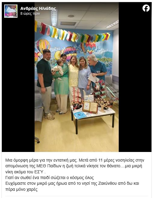 Σε ανάρτησή του ο διευθυντής της ΜΕΘ του Πανεπιστημιακού Γενικού Νοσοκομείου Πατρών, δημοσίευσε μία φωτογραφία αναφέρει: «Μια όμορφη μέρα για την εντατική μας. Μετά από 11 μέρες νοσηλείας στην απομόνωση της ΜΕΘ Παίδων η ζωή τελικά νίκησε τον θάνατο… μια μικρή νίκη ακόμα του ΕΣΎ. Γιατί αν σωθεί ένα παιδί σώζεται ο κόσμος όλος. Ευχόμαστε στον μικρό μας ήρωα από το νησί της Ζακύνθου από δω και πέρα μόνο χαρές».