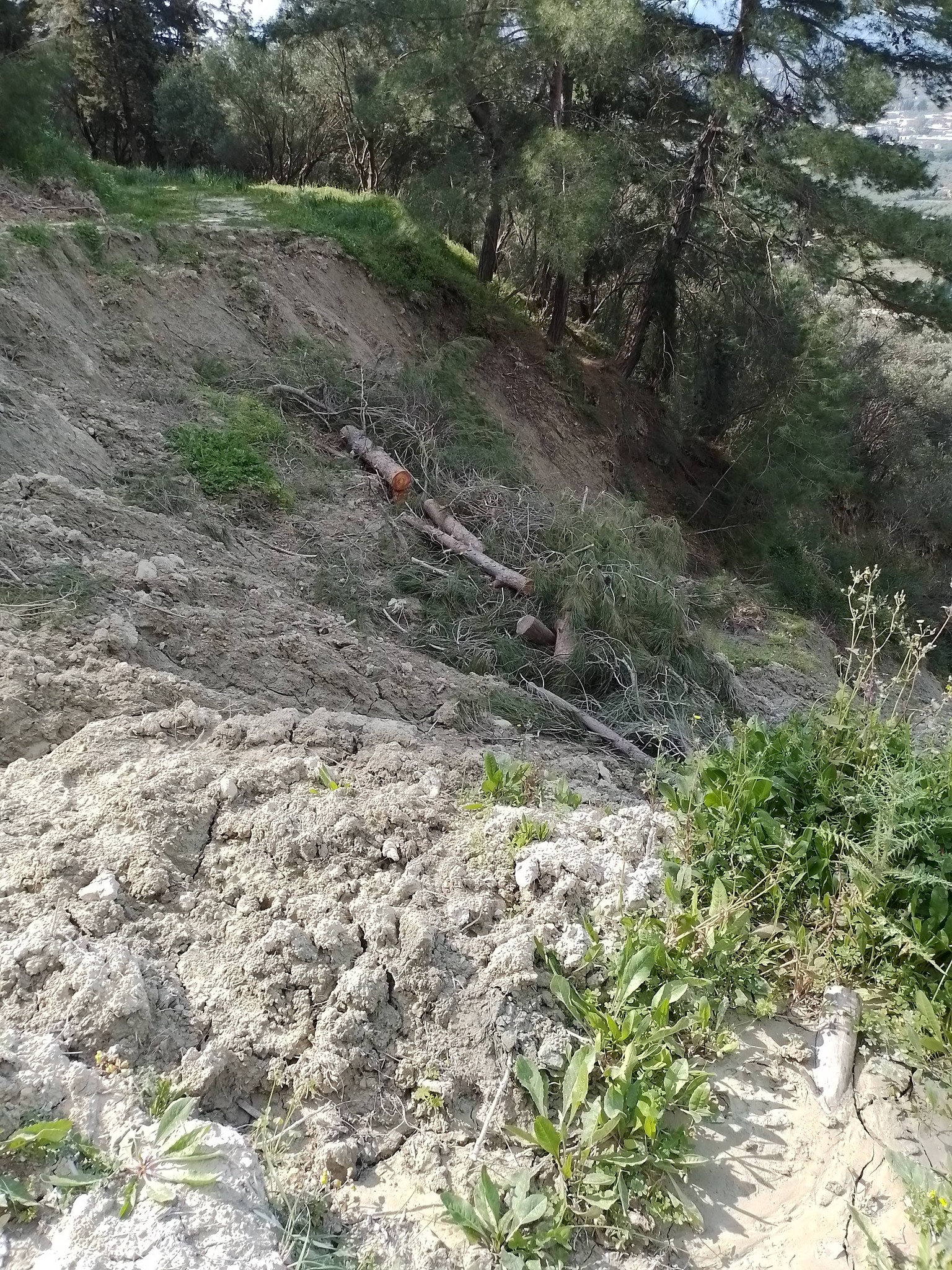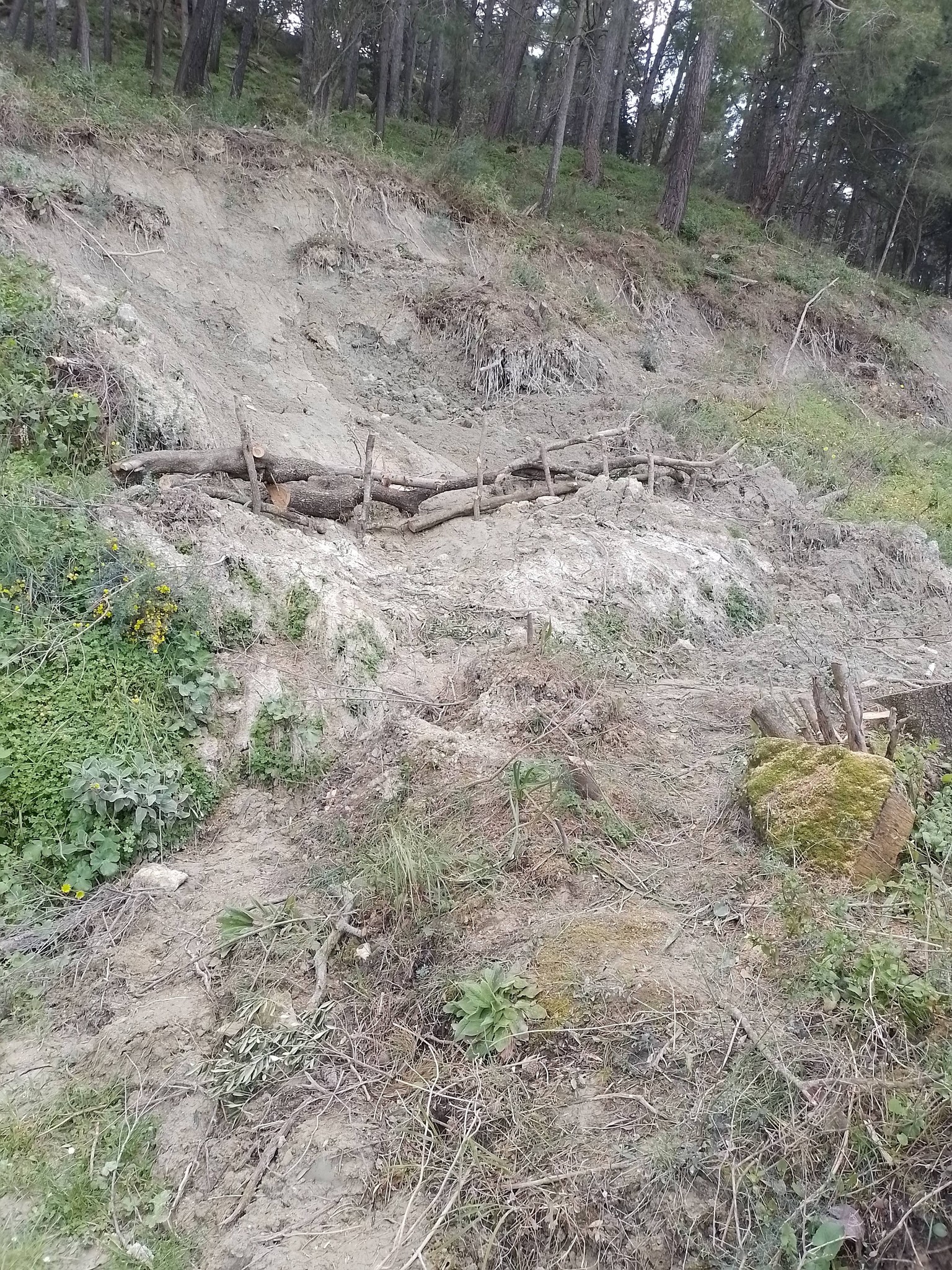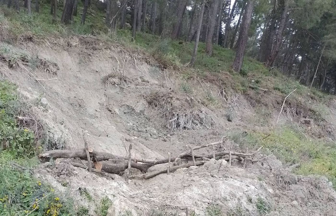 Εκεί που είχε πέσει, κόψανε το δέντρο , βάλανε πάλι δύο-τρεις πασσάλους, προφανώς ξύλα που βρήκαν στο σημείο αυτό , και βάλανε τον κορμό να κρατήσει τη δεξιά μεριά του δρόμου που έχει φύγει όλη προς την χαράδρα.