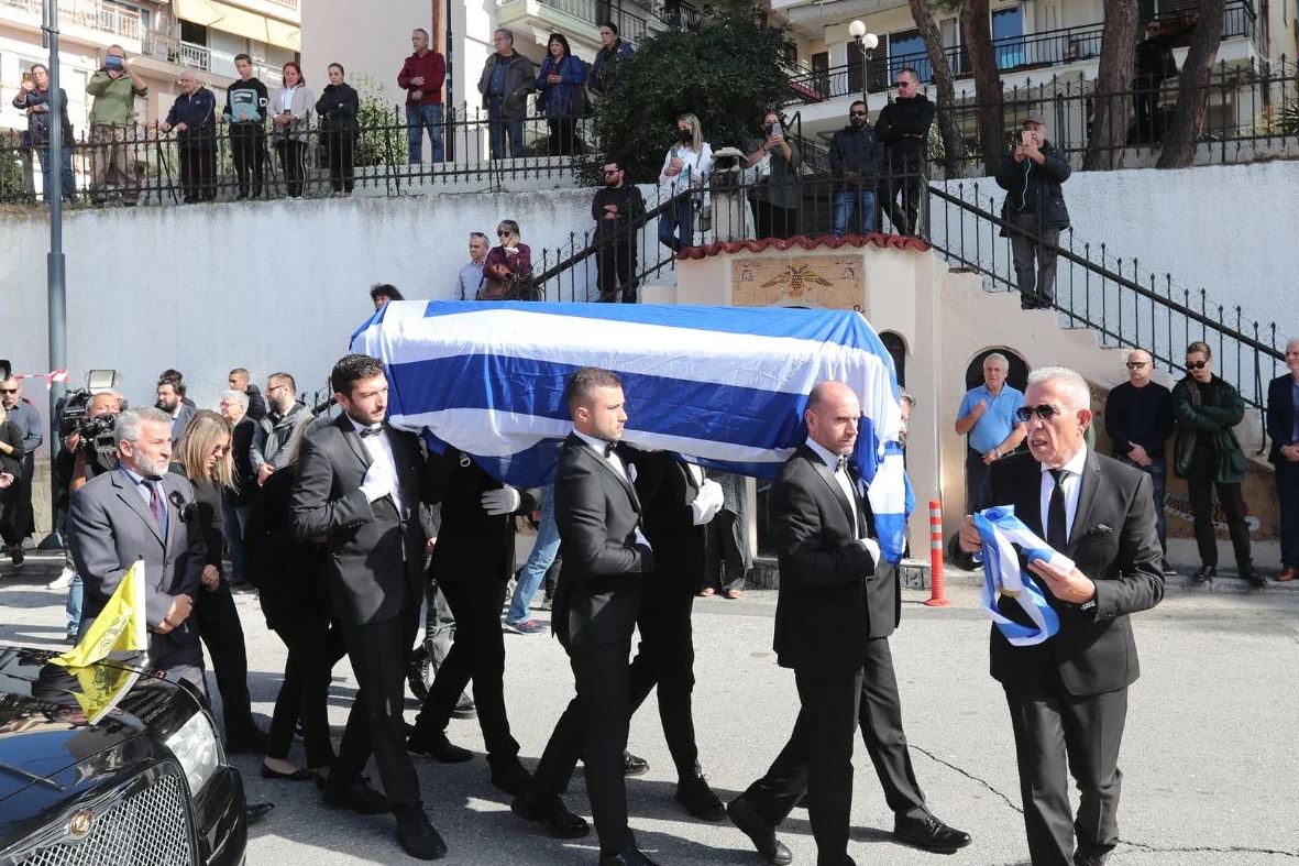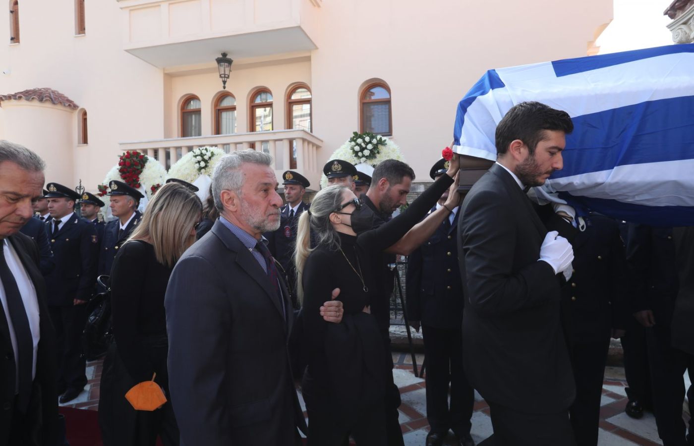 Τραγικές φιγούρες οι γονείς του και η σύζυγός του, Δώρα Τσαμπάζη, η οποία αποχαιρετά τον άνθρωπό της και πατέρα των δύο ανήλικων παιδιών τους.
