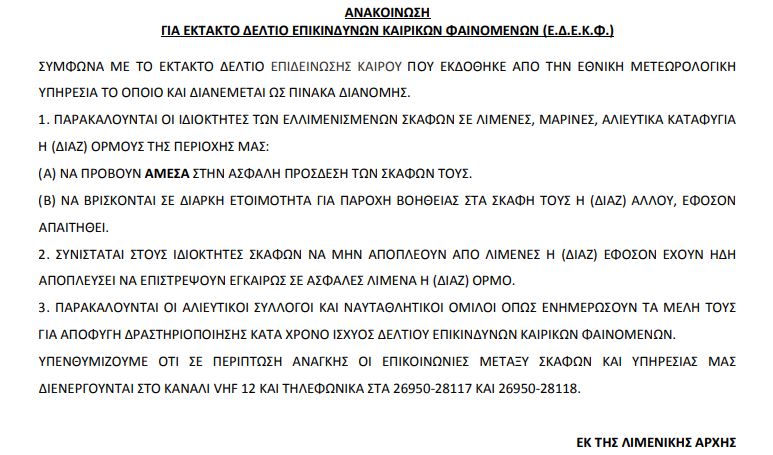 Λιμεναρχείο Ζακύνθου : Ανακοίνωση για Έκτακτο Δελτίο Επικίνδυνων Καιρικών Φαινομένων