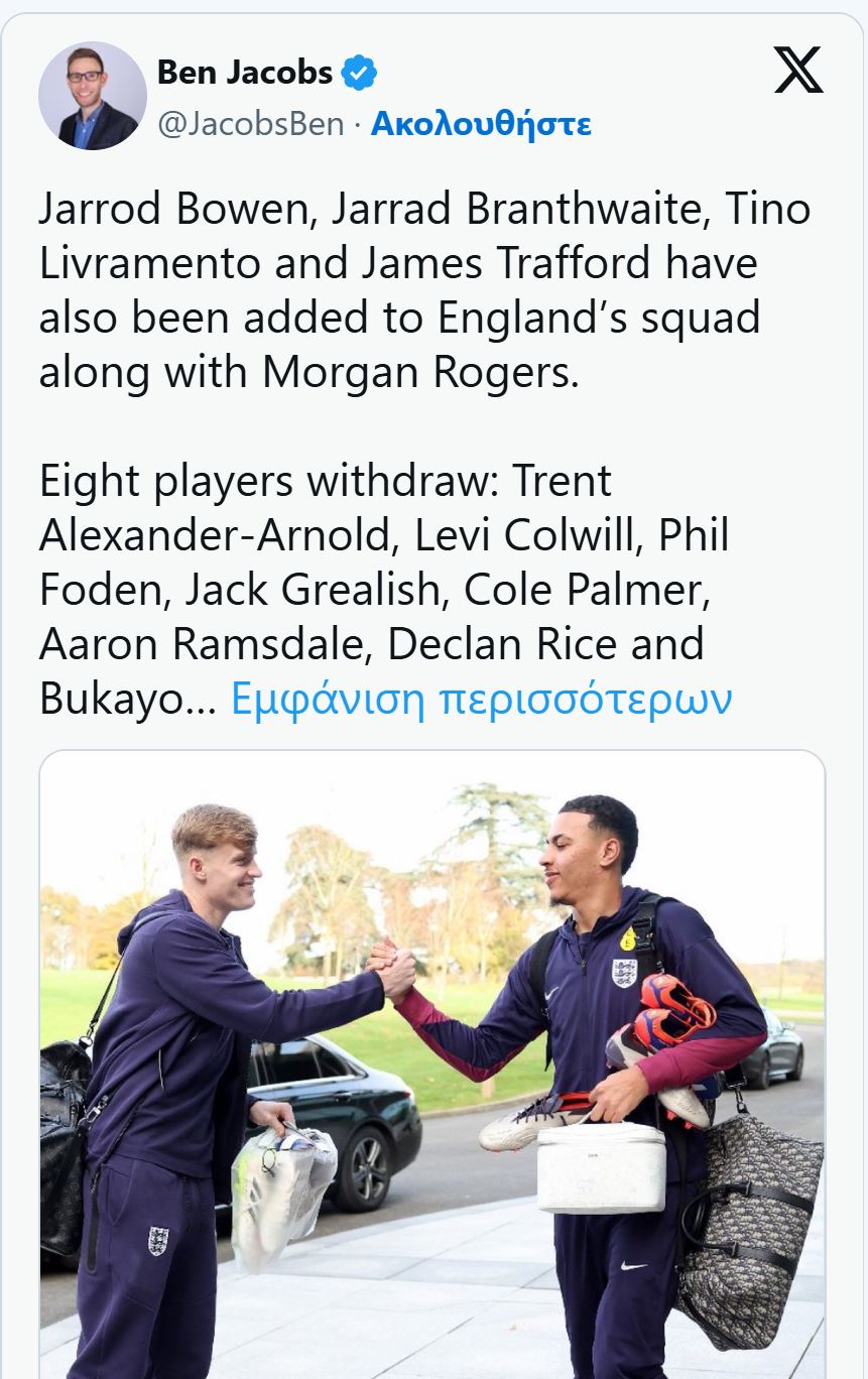Σύμφωνα με όσα ανέφεραν μάλιστα τα ΜΜΕ στο Νησί από νωρίς και επιβεβαιώθηκαν όταν έγινε γνωστή η αποστολή, η Αγγλία θα έρθει στην Ελλάδα με πολλές και σημαντικές απουσίες. Αυτό γιατί τα «τρία λιοντάρια» δεν θα έχουν διαθέσιμους τους Τρεντ Αλεξάντερ-Άρνολντ, Λέβι Κόλγουϊλ, Φιλ Φόντεν, Τζακ Γκρίλις, Κόουλ Πάλμερ, Άαρον Ράμσντεϊλ, Ντέκλαν Ράις και Μπουκάγιο Σάκα.