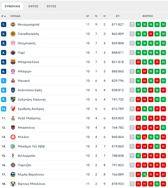 Δείτε πως έχει διαμορφωθεί η βαθμολογία της Euroleague μετά την νίκη της Φενέρμπαχτσε απέναντι στη Βίρτους Μπολόνια.