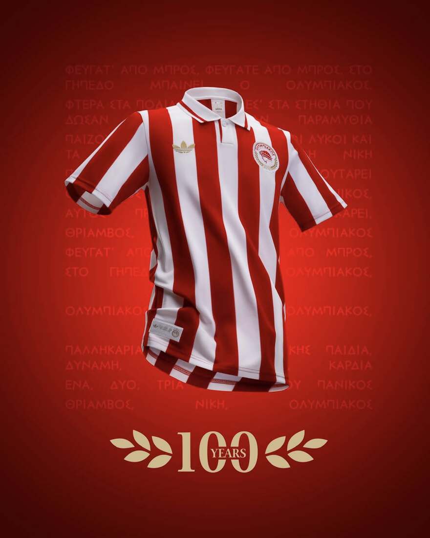 Η adidas και η ΠΑΕ Ολυμπιακός παρουσιάζουν με περηφάνια τη συλλεκτική επετειακή εμφάνιση για τα 100 χρόνια από την ίδρυση της ομάδας που συμπληρώνονται φέτος φέρνοντας και πάλι στο προσκήνιο το ένδοξο παρελθόν του Ολυμπιακού. Εμπνευσμένη από την πορεία της ομάδας και τις χαρακτηριστικές ερυθρόλευκες εντός έδρας εμφανίσεις της, η δημιουργική ομάδα σχεδιαστών στα κεντρικά της adidas συμπεριέλαβε τον «θρυλικό» συνδυασμό από κόκκινες και λευκές ρίγες που αντικατοπτρίζουν την ιστορική διαδρομή του Ολυμπιακού.