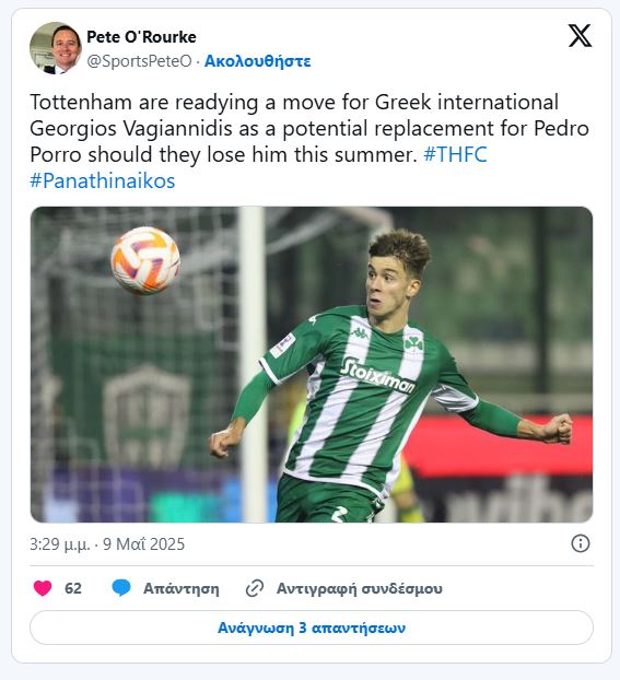 Ο Γιώργος Βαγιαννίδης είναι μέσα στους υποψήφιους για την αντικατάσταση του Ισπανού μπακ, σύμφωνα με τον Πιτ Ο’ Ρουρκ, από το «footyinsider247». O Έλληνας αμυντικός έχει προσελκύσει το ενδιαφέρον πολλών ομάδων, αλλά η Τότεναμ έχει την πιο μεγάλη ισχύ από όλους τους άλλους «μνηστήρες».