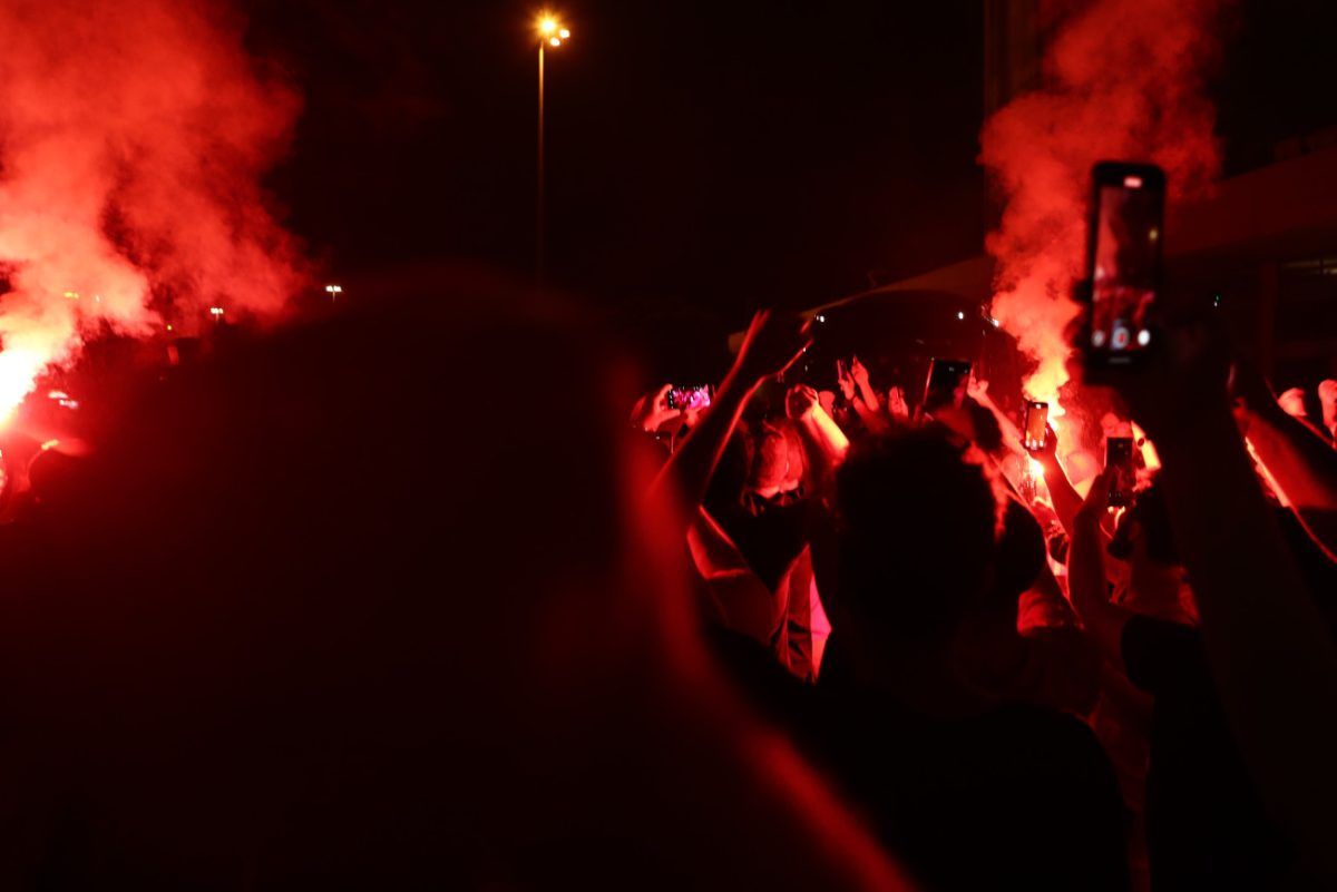 Οι οπαδοί του Ολυμπιακού βρέθηκαν στο Στάδιο Ειρήνης και Φιλίας για να υποδεχθούν τους παίκτες του Γιώργου Μπαρτζώκα και να τους αποθεώσουν μετά το διπλό στο ΟΑΚΑ.