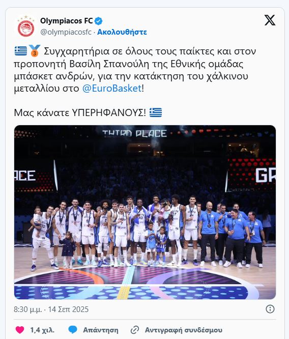 Η ΠΑΕ Ολυμπιακός έστειλε συγχαρητήρια στην Εθνική για την κατάκτηση του χάλκινου μεταλλίου στο Eurobasket 2025