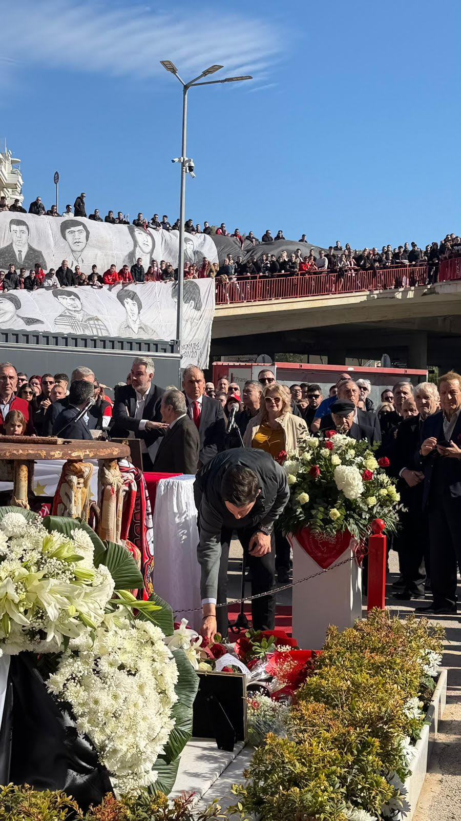 Τιμώντας τη μνήμη των 21 φιλάθλων του Ολυμπιακού που έχασαν τη ζωή τους, πριν από 45 χρόνια, στο γήπεδο της αγαπημένης τους ομάδας, κατέθεσε ένα λουλούδι και δήλωσε: