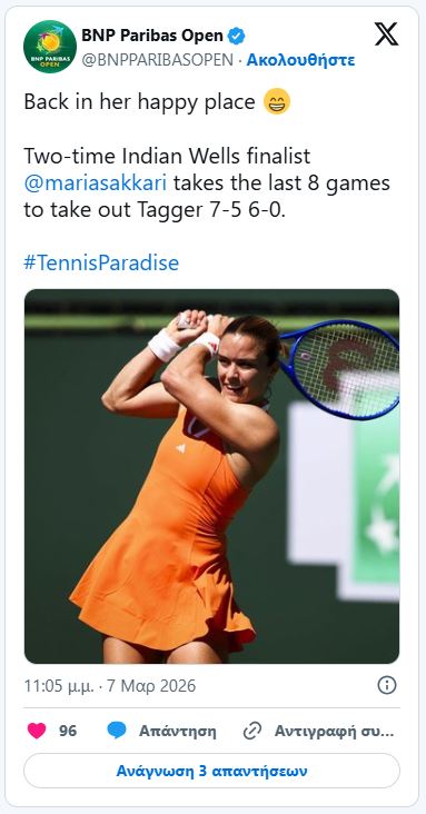 Σάκκαρη – Τάγκερ 2-0: Άνετη πρόκριση για τη Μαρία στους «32» του Indian Wells