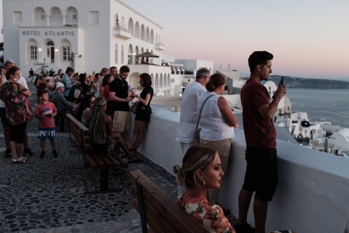 Κάποιοι τολμούν την απογευματινή ζέστη για να βρουν ένα καλό σημείο ανάμεσα στα ασβεστωμένα σπίτια και τις εκκλησίες με γαλάζιο τρούλο, όπου στη συνέχεια περιμένουν ώρες για να παρακολουθήσουν το φημισμένο ηλιοβασίλεμα του ελληνικού νησιού.