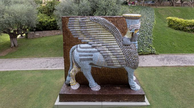 Είναι φτιαγμένο από κονσέρβες σιροπιού χουρμά από το Ιράκ και αναπαριστά άγαλμα που λεηλατήθηκε το 2014 από το ISIS