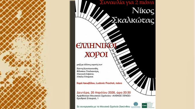 Το Μουσικό Σχολείο Ζακύνθου διοργανώνει συναυλία Αφιέρωμα στο Νίκο Σκαλκώτα με έργα για 2 πιάνα .