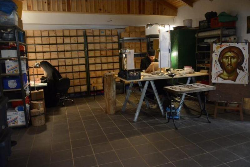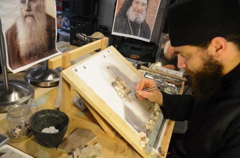 Και τα υλικά πού τα βρίσκουν; «Από την Ιταλία παίρνουμε το ειδικό σμάλτο, το οποίο το φτιάχνουν συγκεκριμένα εργαστήρια με τον ίδιο τρόπο αιώνες τώρα, και έγχρωμο γυαλί· από τις παραλίες παίρνουμε βότσαλα και από διάφορα σημεία μπορούμε να βρούμε φυσικές πέτρες», απαντά ο πατήρ Άθως, κι εμείς αντιλαμβανόμαστε έκθαμβοι πως ένα ψηφιδωτό με φυσικές πέτρες μπορεί να κουβαλά όλη τη μνήμη του χρόνου, την ιστορία της Γης…