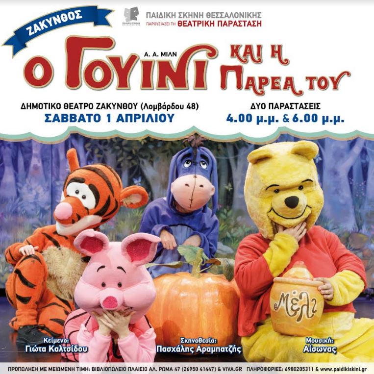 Ο Γουίνι, ο πιο διάσημος και αξιολάτρευτος αρκούδος, μαζί με την αγαπημένη του παρέα έρχονται στην Ζάκυνθο, για πρώτη φορά στην Ελλάδα σε θεατρική παράσταση, στο πλαίσιο της περιοδείας τους, με μια τρυφερή και ξεκαρδιστική ιστορία που θα ξετρελάνει μικρούς και μεγάλους. Η παραγωγή της Παιδικής Σκηνής Θεσσαλονίκης θα ανεβεί το Σάββατο 1 Απριλίου στις 16.00 & 18.00 στο Δημοτικό Θέατρο Ζακύνθου (Λομβάδου 48).