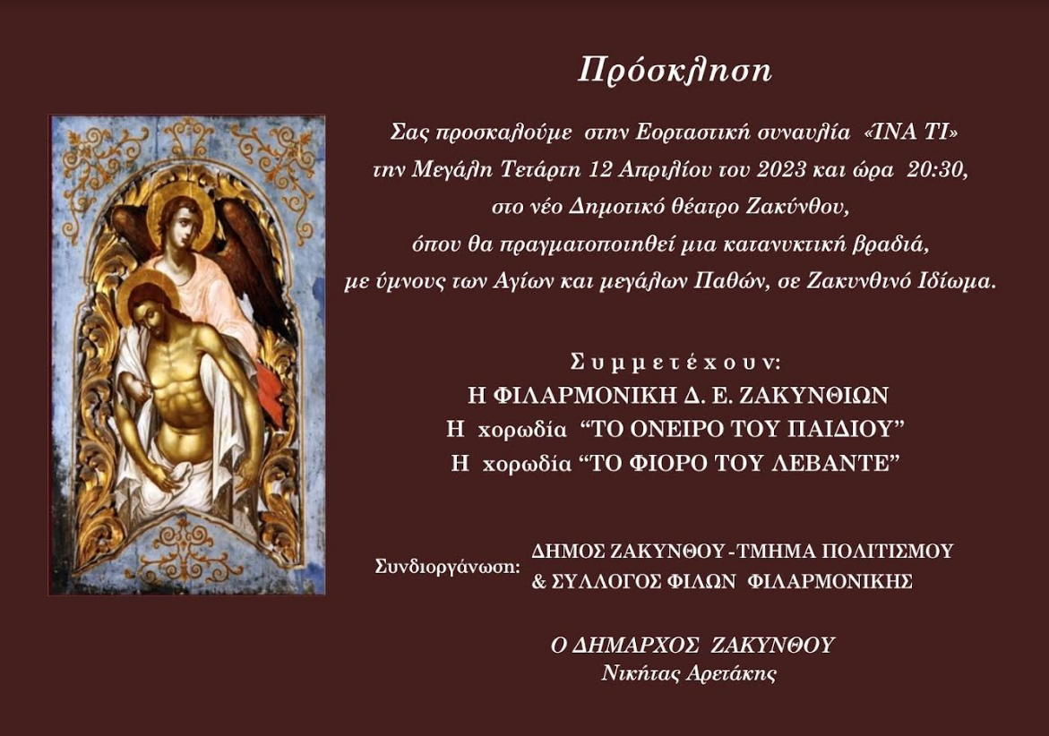 Η καθιερωμένη εορταστική συναυλία «ΊΝΑ ΤΙ», θα πραγματοποιηθεί την Μεγάλη Τετάρτη 12 Απριλίου του 2023 και ώρα 20:30, στο νέο Δημοτικό Θέατρο Ζακύνθου, με ύμνους των Αγίων και μεγάλων Παθών, σε Ζακυνθινό Ιδίωμα.