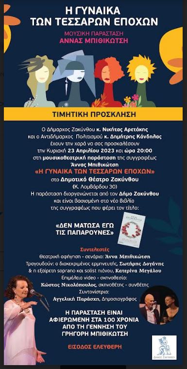 Ο Δήμος Ζακύνθου, σας καλεί να παρακολουθήσετε τη μουσικοθεατρική παράσταση της συγγραφέως Άννας Μπιθικώτση με τίτλο: "Η ΓΥΝΑΙΚΑ ΤΩΝ ΤΕΣΣΑΡΩΝ ΕΠΟΧΩΝ", που παρουσιάζεται την Κυριακή 23 Απριλίου 2023 και ώρα 20:00, στο Δημοτικό θέατρο Ζακύνθου Κ. Λομβάρδου 30