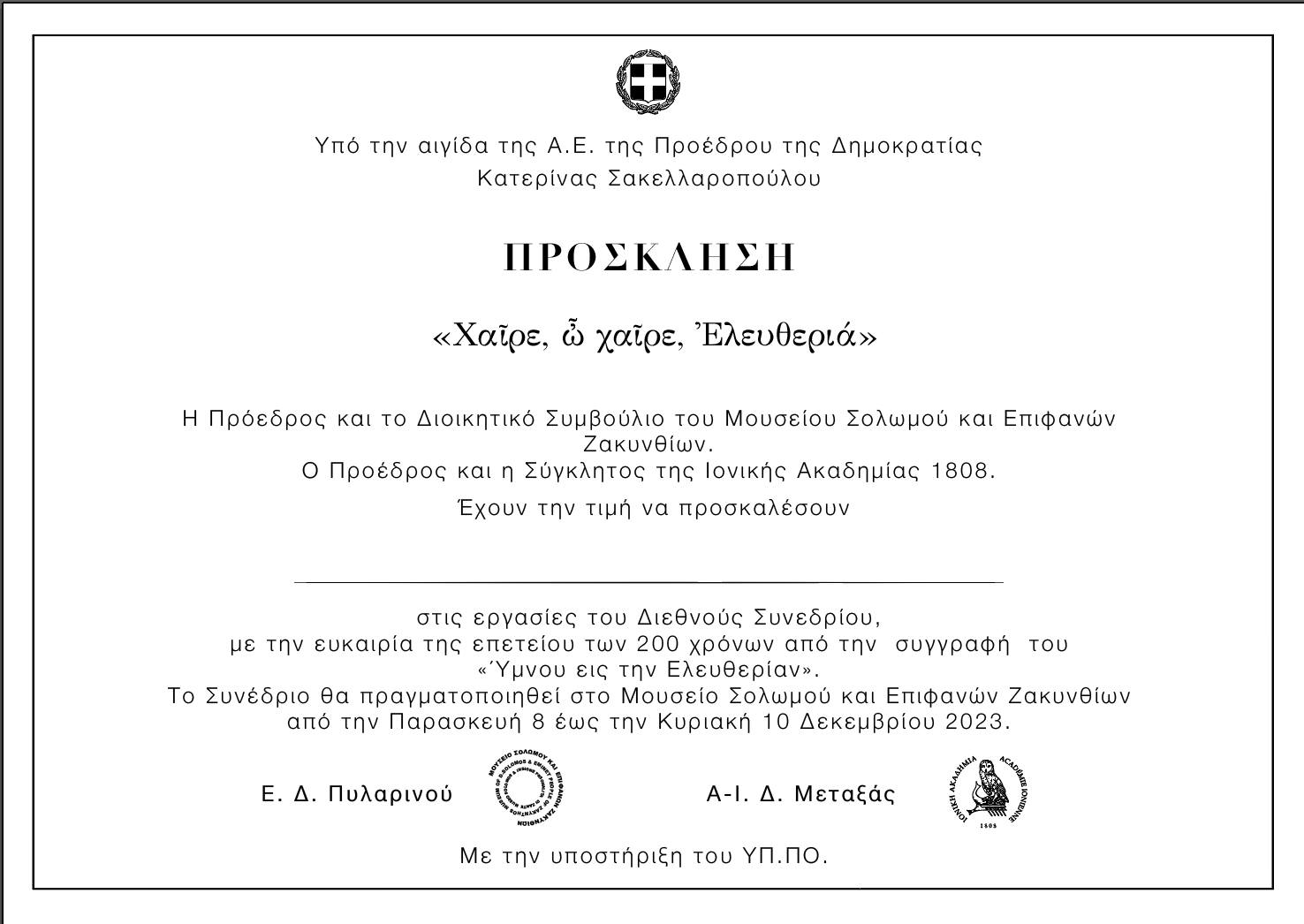 Το 2023 συμπληρώνονται 200 χρόνια από τη συγγραφή του ποιήματος του Διονυσίου Σολωμού , “Ύμνος εις την Ελευθερίαν” . Το Διοικητικό Συμβούλιο του Μουσείου Σολωμού & Επιφανών Ζακυνθιίων με ομόφωνη απόφασή του κήρυξε το 2023 “Έτος Ύμνου εις την Ελευθερίαν”. Το αποκορύφωμα των εκδηλώσεων, οι οποίες έγιναν κατά τη διάρκεια του έτους είναι το Διεθνές Συνέδριο στις 8, 9 και 10 Δεκεμβρίου 2023 και το οποίο θα πραγματοποιηθεί στις αίθουσες του Μουσείου, σε συνεργασία με την “Ιονική Ακαδημία 1808“.