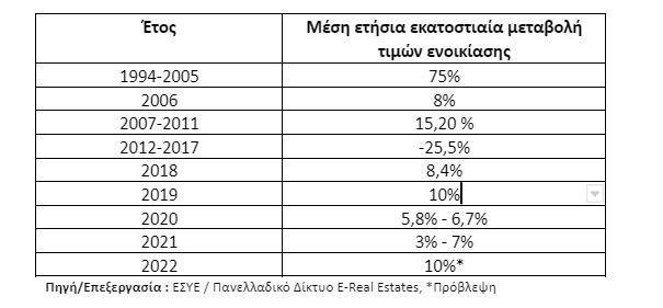 μονάδες πάνω από τον πληθωρισμό το 2005 και κατά 5,8 ποσοστιαίες μονάδες πάνω από τον πληθωρισμό το πρώτο τρίμηνο του 2006. Ενώ από το 2007 έως και το 2011 καταγράφηκε αύξηση των ενοικίων +15,20 % , από το 2012 ως το 2017 καταγράφηκε μείωση που άγγιξε το -25,5 %, ενώ το 2018 επιστρέφουν με αύξηση +8,4 % , το 2019 ο ρυθμός αύξησης των ενοικίων άγγιξε το +10% και το 2020 κυμάνθηκε από 5,8% έως 6,7%. Η ανοδική πορεία συνεχίστηκε και το 2021 από 3% έως 7%, ενώ τη φετινή χρονιά θα αγγίξει το +10%.
