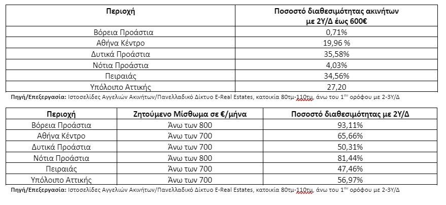 Είναι σημαντικό να αναφέρουμε ότι στο σύνολο των περιοχών του Ν.Αττικής, η διαθεσιμότητα ακίνητων προς μίσθωση είναι πολύ μικρή έναντι των προηγούμενων χρόνων. Παράλληλα ,όπως προκύπτει και από το σύνολο των παρακάτω πινάκων, το μεγαλύτερο μέρος των διαθέσιμων προς μίσθωση ακινήτων διατίθεται με ζητούμενες τιμές μίσθωσης άνω των 800€/μήνα.