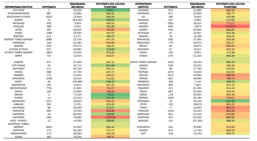 Την εβδομάδα αναφοράς 26 Σεπτεμβρίου - 02 Οκτωβρίου καταγράφηκαν 54.649 κρούσματα COVID-19 (5.238 ανά εκατoμμύριο πληθυσμού: 22% εβδομαδιαία μεταβολή) εκ των οποίων οι επαναλοιμώξεις αφορούν το 25% των λοιμώξεων, σύμφωνα με τη ενημέρωση του ΕΟΔΥ. Ο συνολικός αριθμός των λοιμώξεων από την έναρξη της πανδημίας ανέρχεται σε 4.975.067 εκ των οποίων 52.0% γυναίκες.
