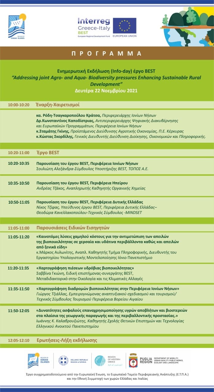 Η Περιφέρεια Ιονίων Νήσων, στο πλαίσιο του έργου διασυνοριακής συνεργασίας “BEST" “Addressing joint Agro- and Aqua- Biodiversity pressures Enhancing Sustainable Rural Development” (Αντιμετώπιση των κοινών πιέσεων στην Αγρο – και Υδρο – Βιοποικιλότητα, Ενίσχυση της Αειφόρου Αγροτικής Ανάπτυξης”) , σας προσκαλεί να συμμετέχετε στην ενημερωτική εκδήλωση που θα πραγματοποιηθεί τη Δευτέρα 31 Οκτωβρίου 2022 στις 11:00 π.μ. στην αίθουσα του Αίθουσα Περιφερειακού Συμβουλίου, Διοικητήριο, Ζάκυνθος με θέμα