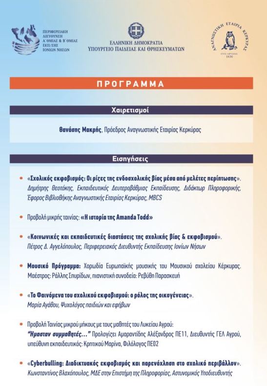 Η 6η Μαρτίου έχει οριστεί ως Πανελλήνια Ημέρα κατά της βίας στο σχολείο. Η Περιφερειακή Διεύθυνση Εκπαίδευσης Ιονίων Νήσων σε συνεργασία με την Διοικητική Επιτροπή της Αναγνωστικής Εταιρίας Κερκύρας διοργανώνει εκδήλωση, με στόχο την ευαισθητοποίηση και τον περιορισμό φαινομένων σχολικής βίας και εκφοβισμού.