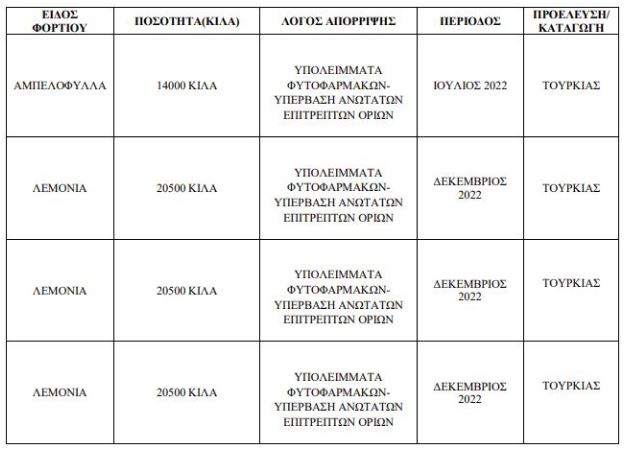 Το 50,52% (292 ειδοποιήσεις) των φορτίων, που απορρίφτηκαν αντιστοιχούν σε ακατάλληλα για κατανάλωση εισαγόμενα φρούτα και λαχανικά μεταξύ 1ης Ιανουαρίου και 31ης Δεκεμβρίου 2022, τα οποία προσπάθησε η Τουρκία να εισαγάγει στις αγορές των χωρών μελών της ΕΕ.
