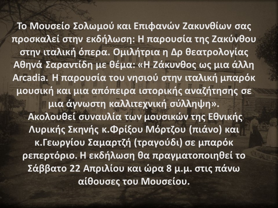 Το Μουσείο Σολωμού και Επιφανών Ζακυνθίων σας προσκαλεί στην εκδήλωση: