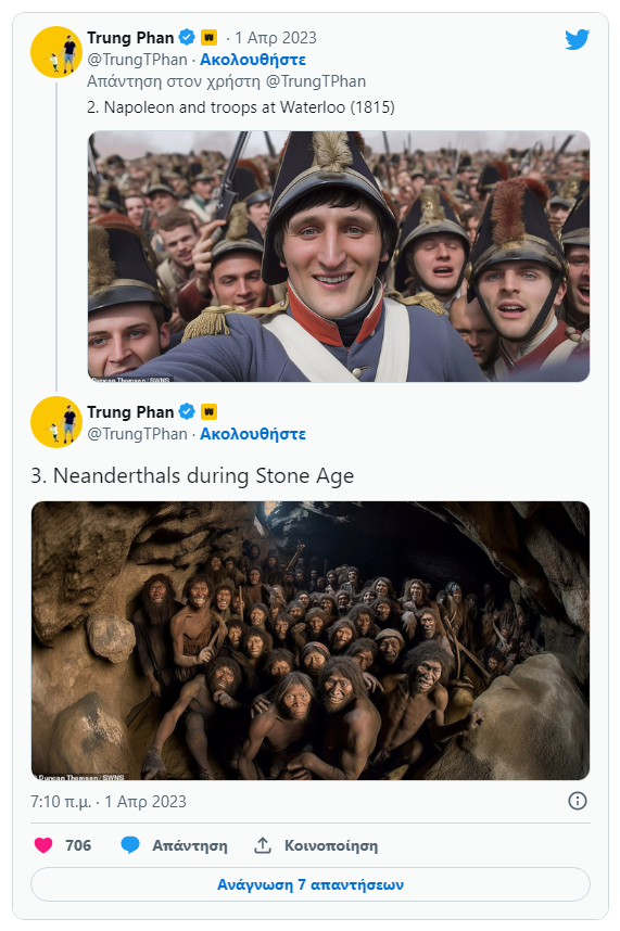 Ο 53χρονος Duncan Thomsen χρησιμοποίησε το λογισμικό Midjourney, το οποίο παράγει εικόνες από περιγραφές φυσικής γλώσσας. Οι εικόνες δείχνουν επίσης στρατιώτες στη μάχη του Βατερλώ και στη μάχη του Αζινκούρ, μαζί με έναν χαμογελαστό Ναπολέοντα.