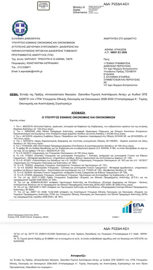 Με την επίσημη απόφαση ένταξης, το έργο «Αποκατάσταση Ναυαγίου Ζακύνθου – Τεχνητή Αναπλήρωση Ακτής» με Κωδικό ΟΠΣ 5228731 εντάσσεται στο Τομεακό Πρόγραμμα Ανάπτυξης του Υπουργείου Εθνικής Οικονομίας και Οικονομικών 2026–2030 .