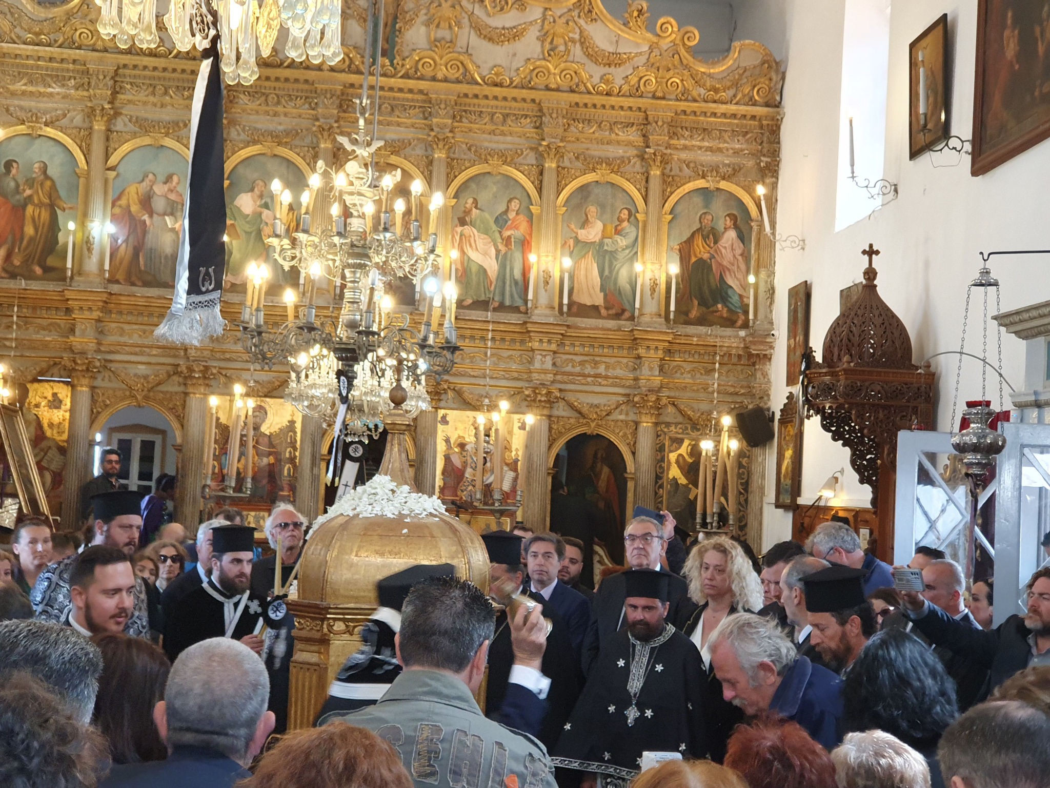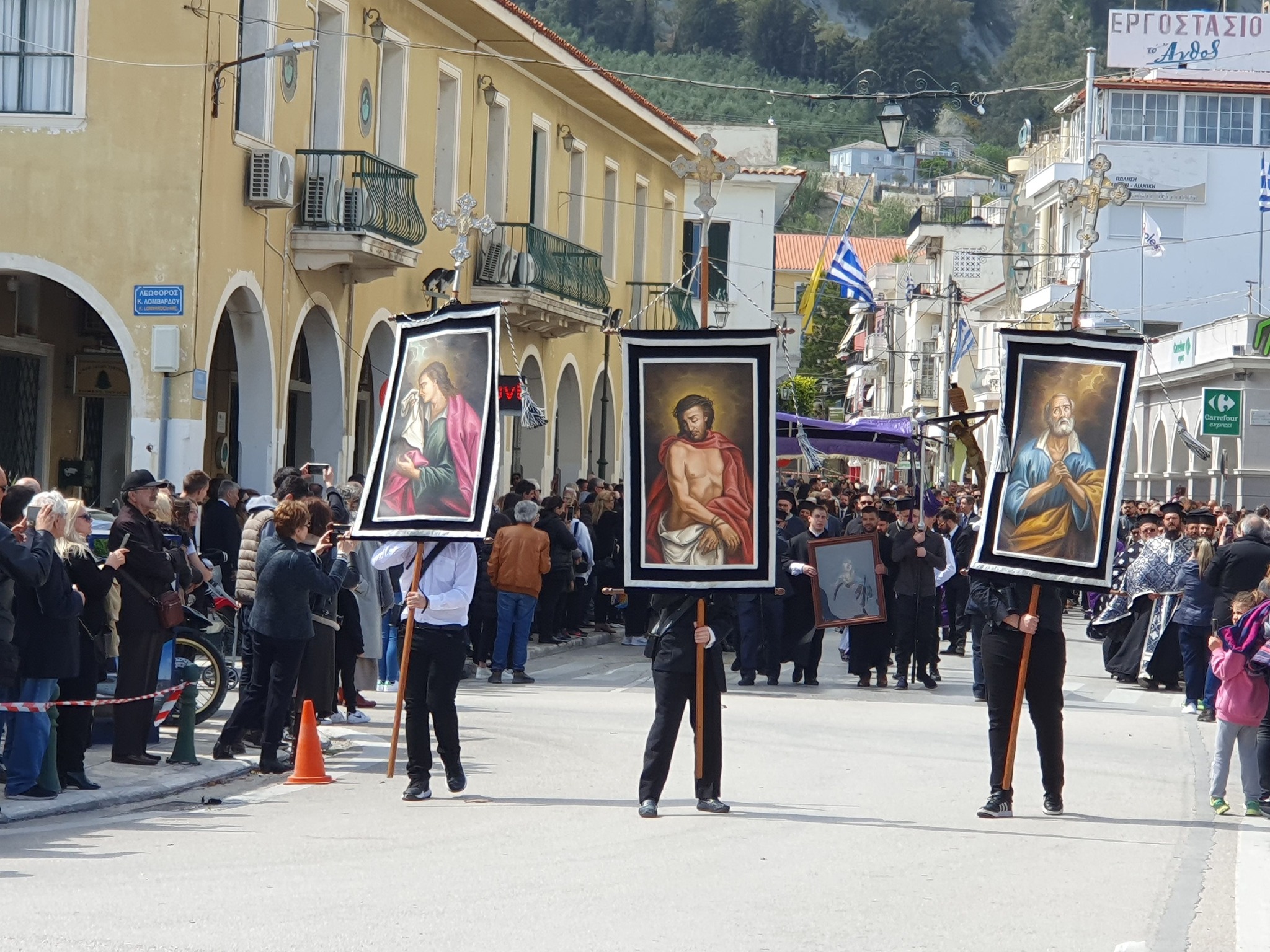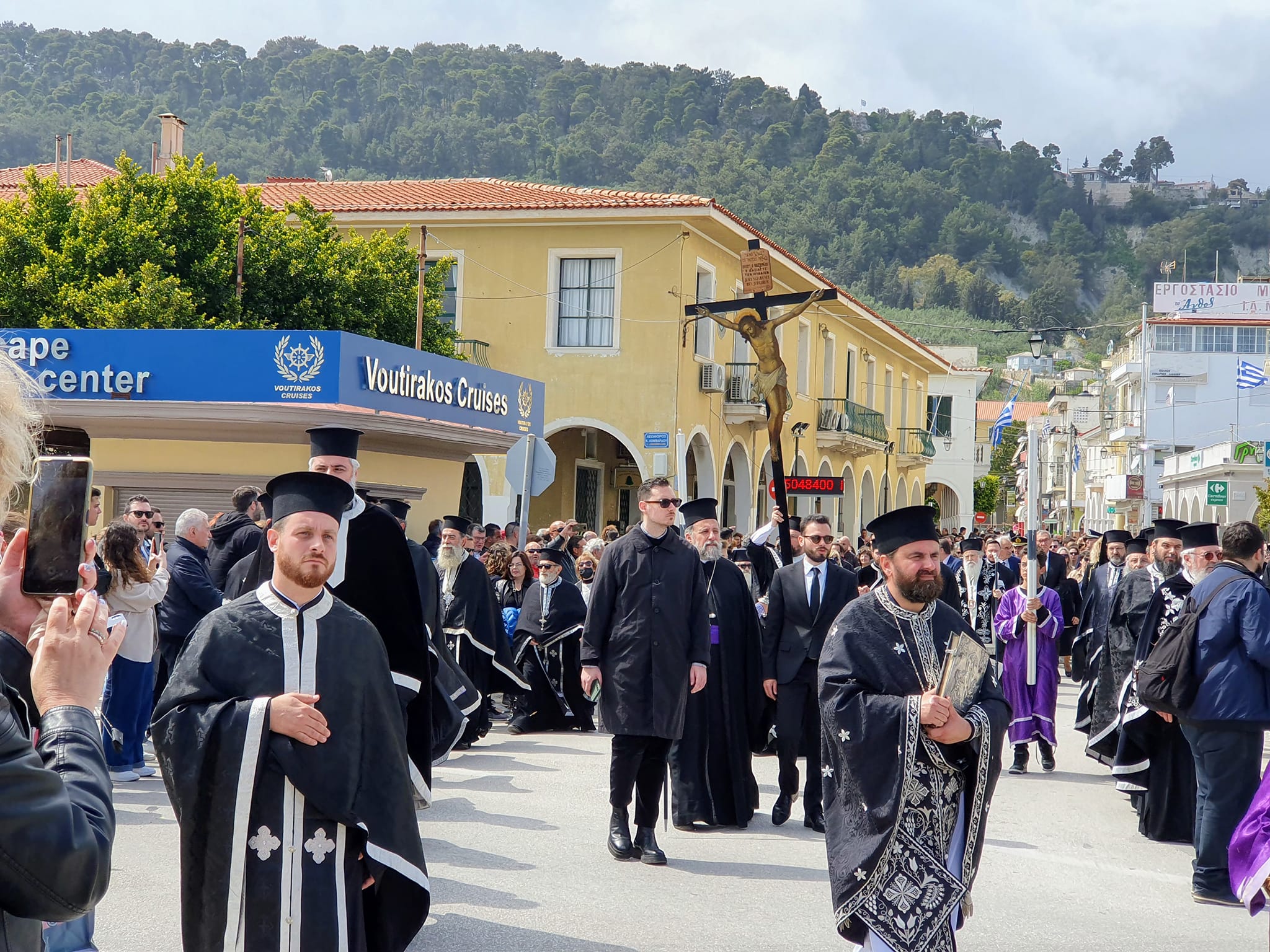 Το μεσημέρι, χιλιάδες πιστοί συρρέουν στην κεντρική πλατεία του νησιού και ακολουθούν τον Εσταυρωμένο και την περίφημη εικόνα Mater Dolorosa μέχρι την εκκλησία του Αγίου Νικολάου των ναυτικών, όπου ο μητροπολίτης ευλογεί τους πιστούς και μεταφέρει τον Εσταυρωμένο στο εσωτερικό της εκκλησίας, όπου και τον τοποθετεί πλέον στον Επιτάφιο. Το βράδυ σε όλες τις εκκλησίες του νησιού ακολουθεί ο επιτάφιος θρήνος.