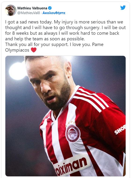 «Έχω δυσάρεστα νέα. Ο τραυματισμός μου είναι πιο σοβαρός από ότι αρχικά πιστεύαμε και θα χρειαστεί να υποβληθώ σε χειρουργική επέμβαση. Θα παραμείνω εκτός δράσης για 8 εβδομάδες, αλλά όπως πάντα, θα δουλέψω σκληρά, με στόχο επιστρέψω το συντομότερο δυνατό για να βοηθήσω την ομάδα. Σας ευχαριστώ όλους για την υποστήριξή σας. Σας αγαπώ. Πάμε Ολυμπιακέ», ανέφερε στο μήνυμά του στα social media ο Γάλλος.