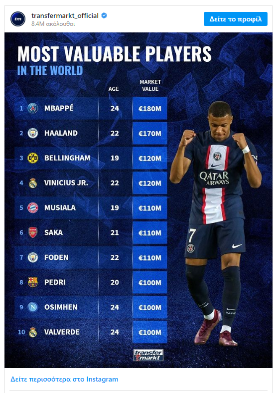 Το Transfermarkt παρουσίασε την δεκάδα των ποδοσφαιριστών που κοστολογούνται πάνω από 100εκατ. Ευρώ