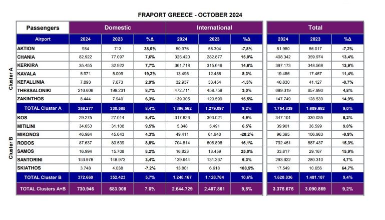 Η Fraport Greece κατέγραψε 3,37 εκατ. ταξιδιώτες τον Οκτώβριο, σημειώνοντας αύξηση κατά 9,2% σε σύγκριση με τα 3,09 εκατ. ταξιδιωτών του αντίστοιχου περυσινού Οκτωβρίου.