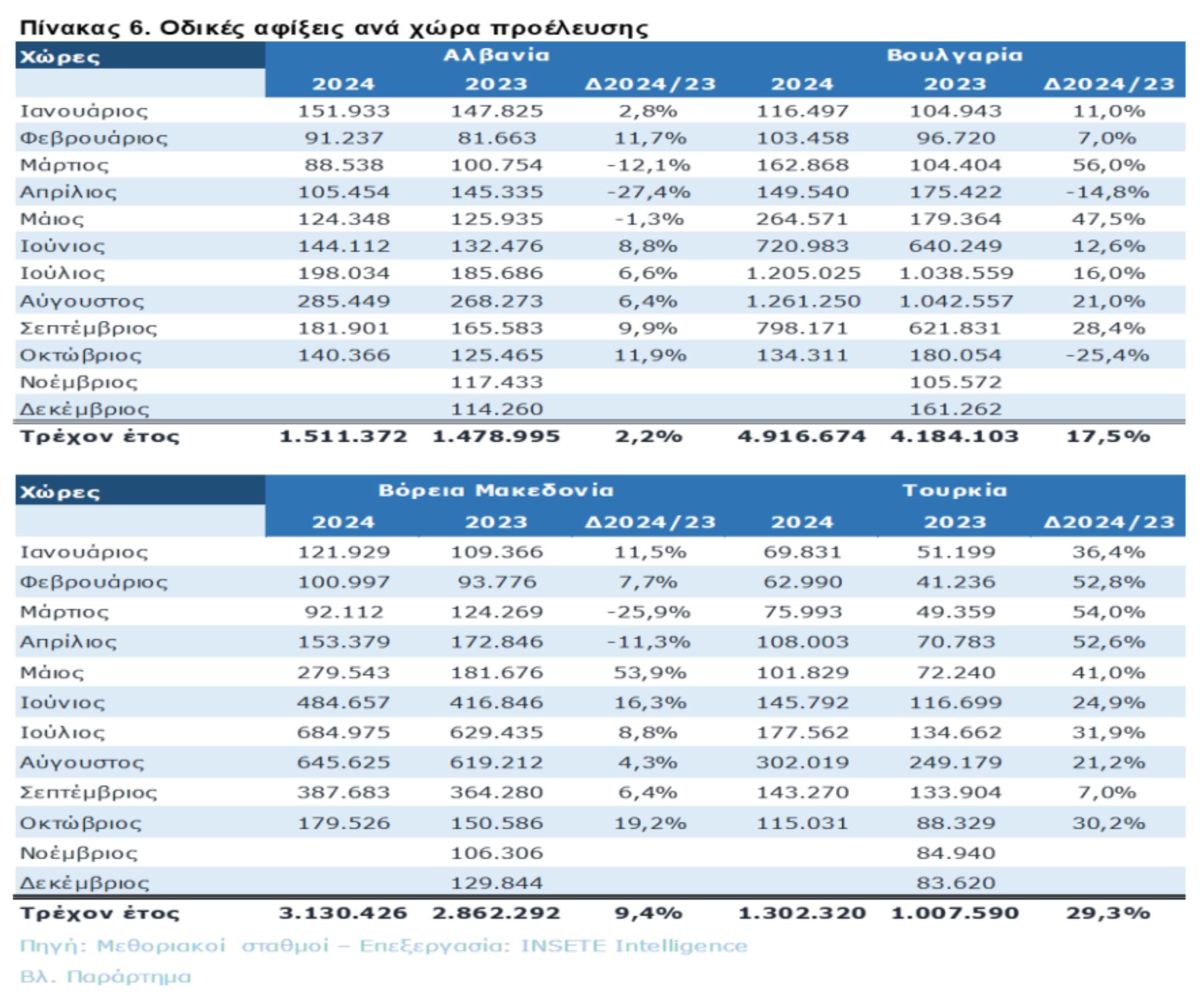 Η Τουρκία κατέγραψε τη μεγαλύτερη ποσοστιαία αύξηση, με τις αφίξεις να αυξάνονται κατά +295 χιλ./+29,5%, φτάνοντας συνολικά τις 1,3 εκατ. Από τη Βόρεια Μακεδονία, οι αφίξεις αυξήθηκαν κατά +268 χιλ./+9,4%, με το σύνολο να διαμορφώνεται σε 3,1 εκατ. αφίξεις. Τέλος, η κίνηση από την Αλβανία αυξήθηκε κατά +32 χιλ./+2,2%, φτάνοντας τις 1,5 εκατ. αφίξεις.