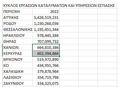 Επιπλέον στη σχετική κατάταξη του κύκλου εργασιών της ΕΛΣΤΑΤ στην πρώτη δωδεκάδα περιλαμβάνονται και περιοχές έκπληξη όπως π.χ. το Λασίθι που καταλαμβάνει την ενδέκατη θέση στις περιοχές με τον υψηλότερο τζίρο σε καταλύματα και εστίαση στη Ελλάδα.